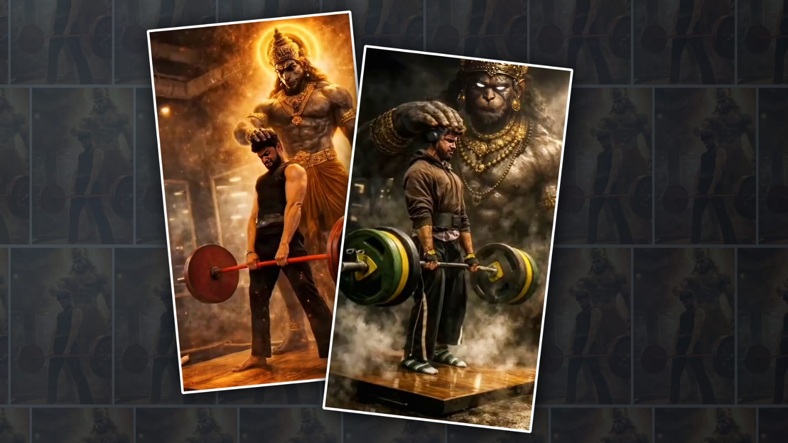 Create a highly dramatic and cinematic Person Behind him, generate a massive, divine, Hanuman ji with glowing red eyes and detailed golden jewellery. The divine figure should appear like a protective guardian emerging from smoke and shadows, placing a gentle, powerful hand over the man’s head as if giving him strength. Use dark, moody lighting with strong contrast, gym environment details, smoke effects, rim lights, and hyper-realistic textures. Make the entire image intense, powerful, and motiv